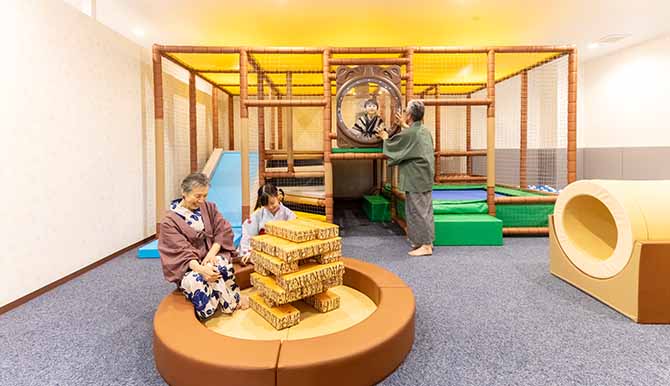 雨の日が心配な方には「RYOKAN OQOQ」(島根)が最適で、広々したキッズスペースで1日遊べます。