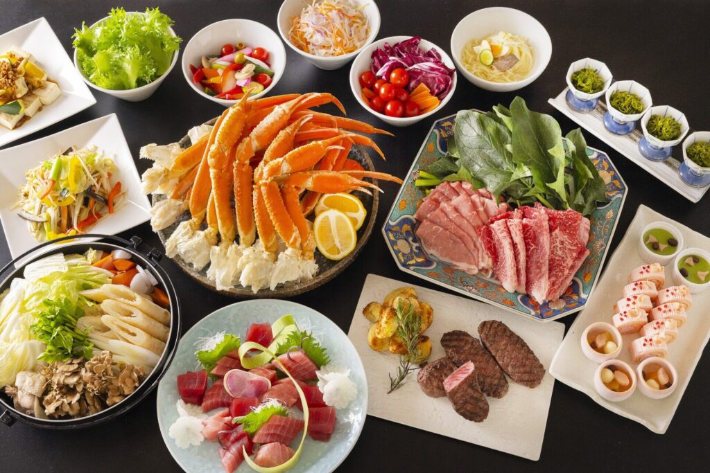 ビュッフェでは、岩手のブランド牛「前沢牛」のしゃぶしゃぶ、ボイルトゲズワイ蟹や旬のお刺身が食べ放題!!