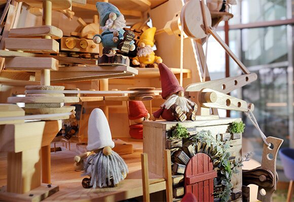 丘の広場/あそびの森では、一年を通して屋内で花巻おもちゃ美術館監修の、おもちゃたちで遊ぶことができます。