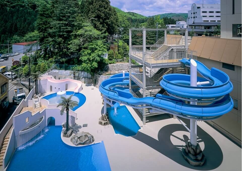 屋内の温水プールと屋外のプールがあり、2つをつなぐ全長90mを越えるウォータースライダーまで!