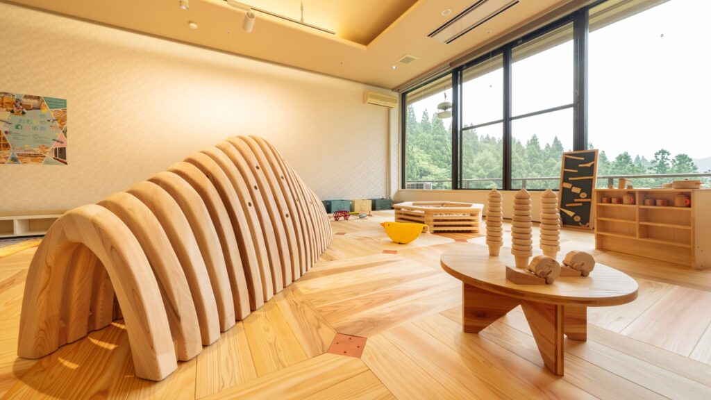 結びの宿 愛隣館では、一年を通して屋内で遊べる、木育広場「月ちゃん・花ちゃん」が人気です。