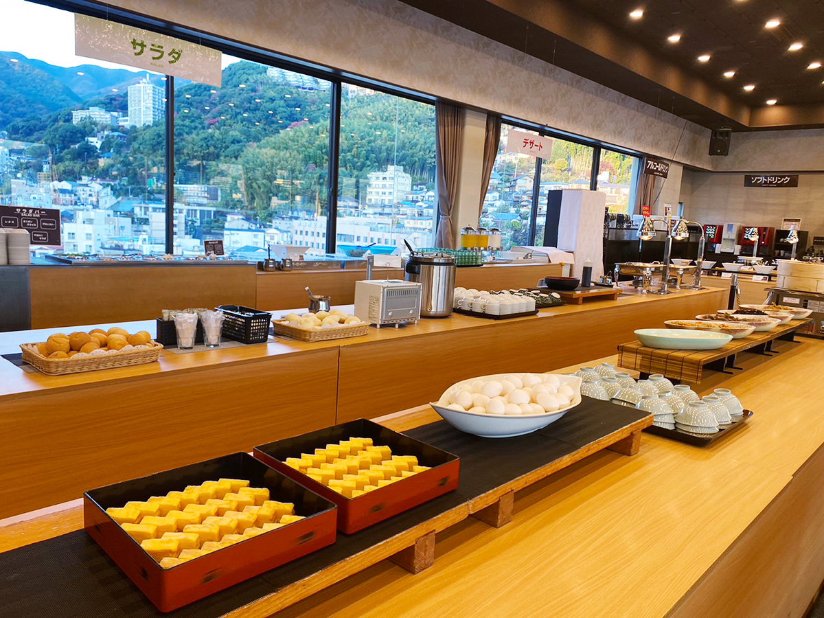 朝の味噌汁コーナーや地元干物が人気で、祖父母世代にも嬉しい和食中心の優しい味付けを楽しむことができます。