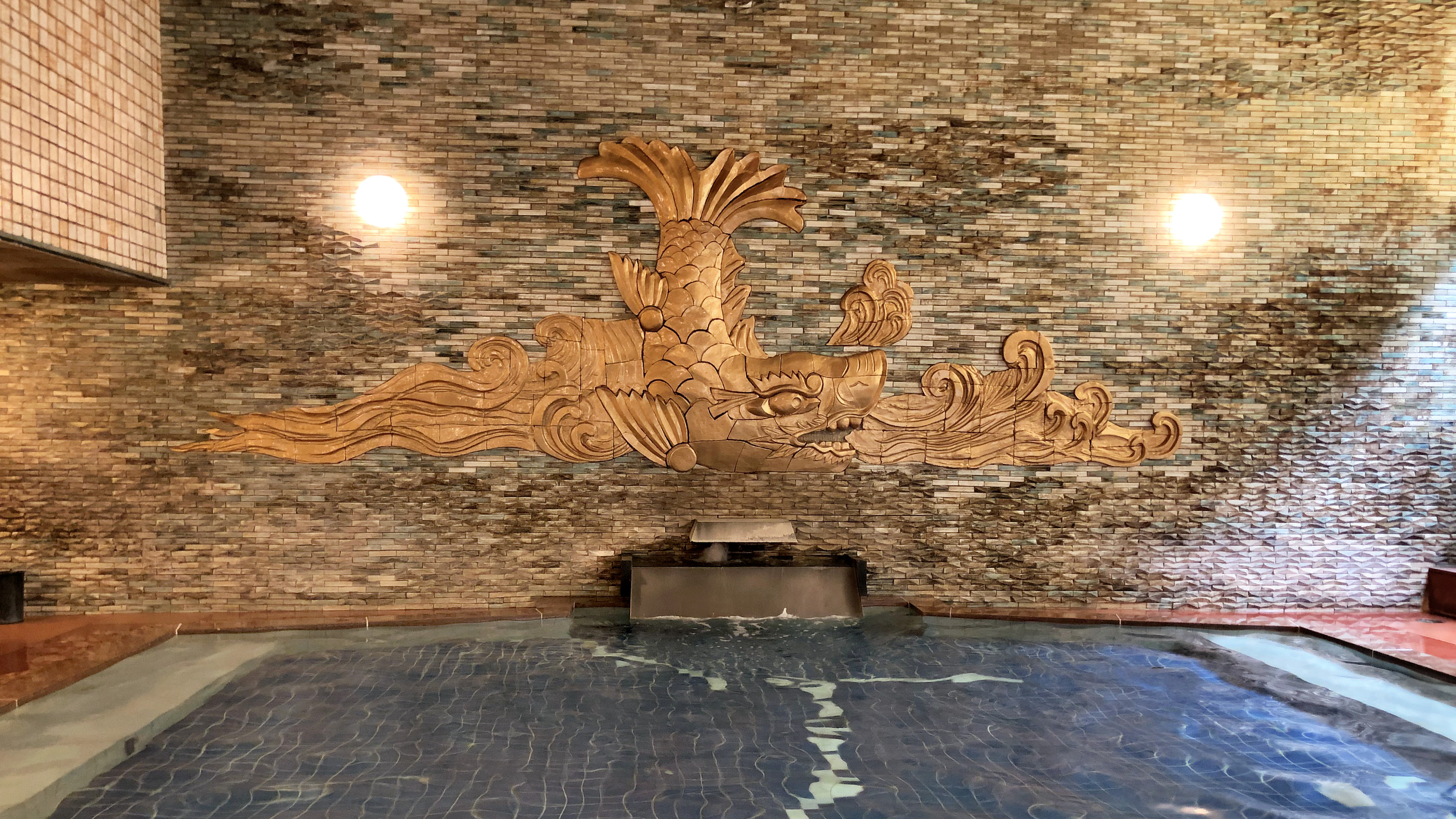 熱海金城館には、金のシャチホコのレリーフが楽しめる大浴場と、庭園風の趣きを楽しめる露天風呂の2種類があります。