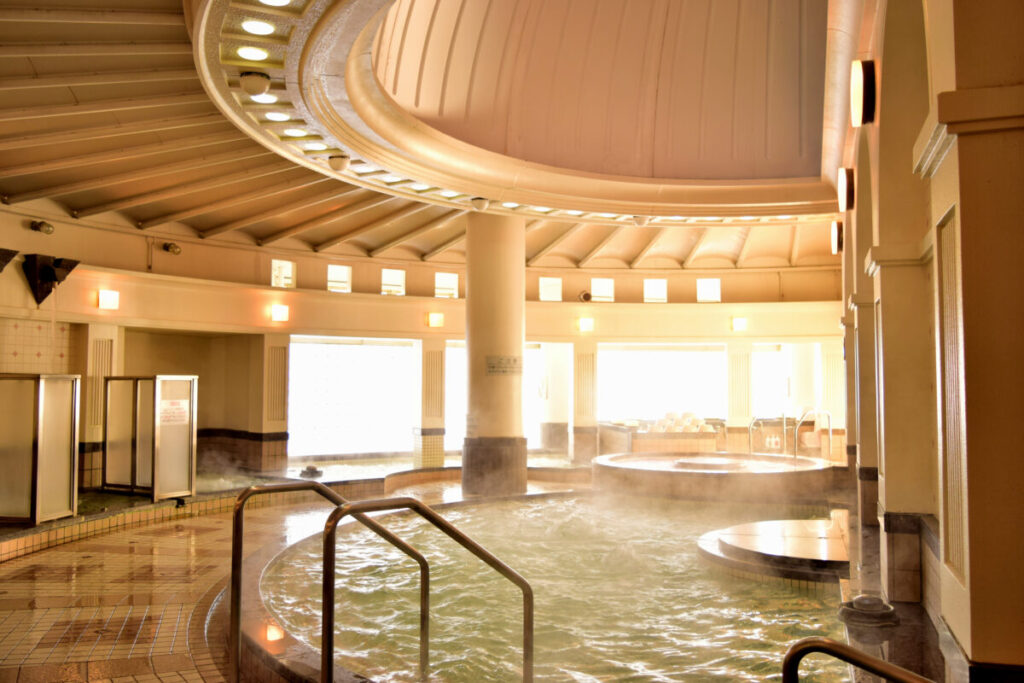 露天風呂と一体感のある開放的な大浴場は、ゆったりと過ごせる空間になっています。