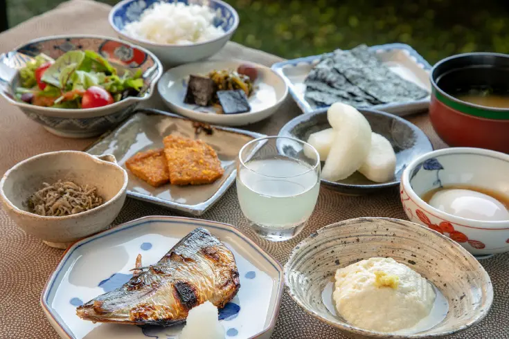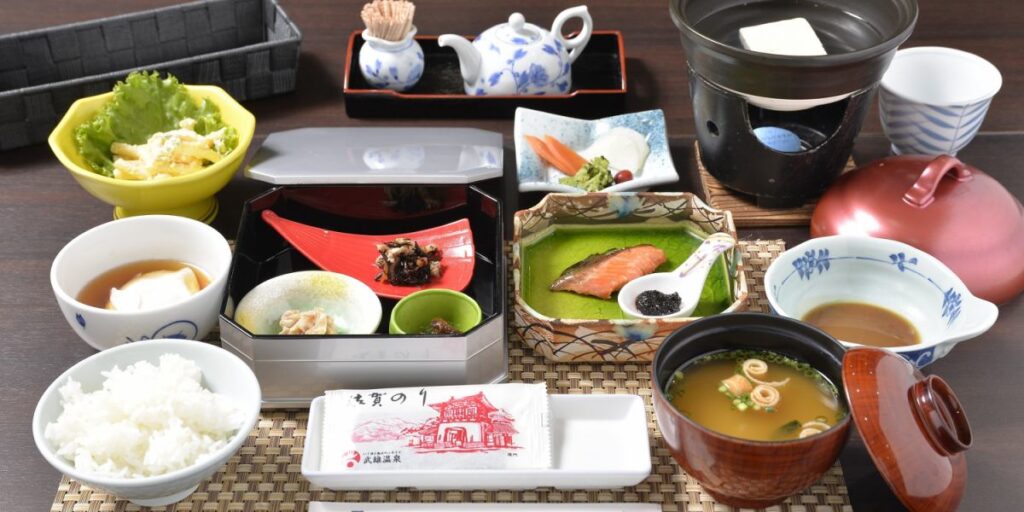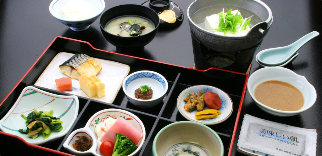 朝食は和朝食で、地物の干物、ざる豆腐、地卵を使った温度卵、名産「ぎょろっけ」、唐津産ちりめんじゃこを使ったちりめん山椒など地物にこだわったメニューを堪能できます。
