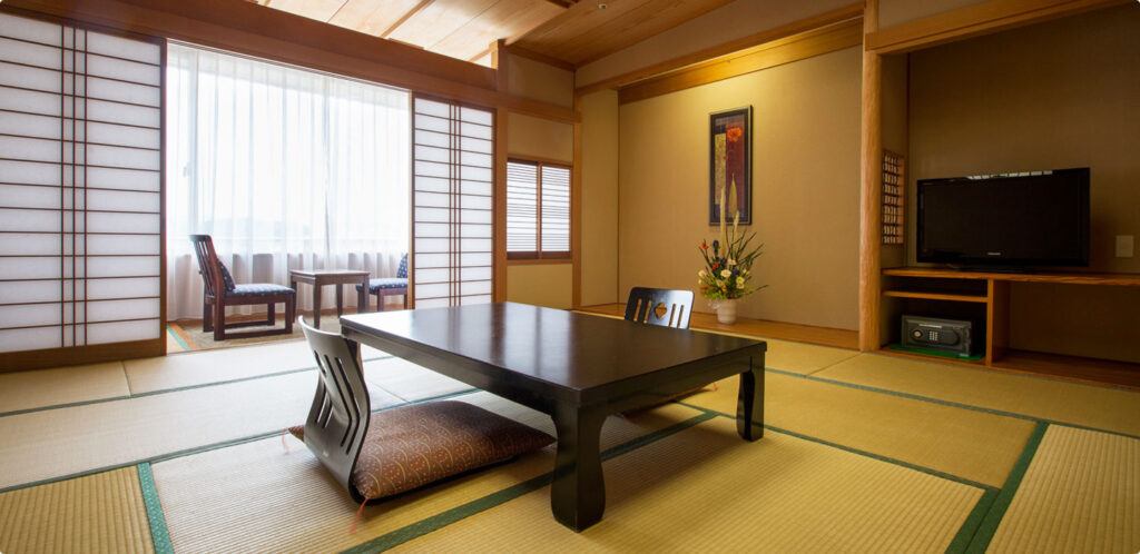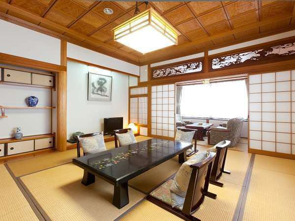| 祖父母向けポイント | 歴史の趣を感じる書院造のお部屋 オーシャンビューの檜の内風呂付のお部屋 |