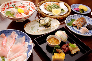 名物「月コース(6,000円)」は、金目鯛や、ヒラメ・カサゴ・アジなど季節の魚をはじめ、ハモやフグなど他の民宿では味わえない多彩な食材まで楽しめる、基本献立全七品のお料理コースです。