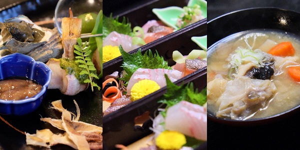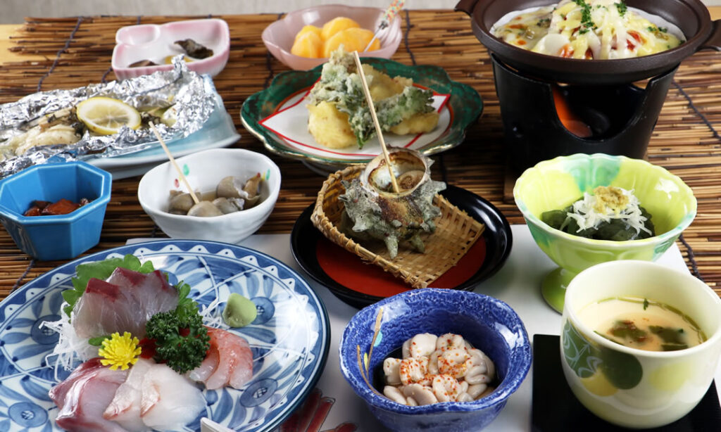 名物「【冬季限定】旬の海鮮で作る日替わり海鮮鍋で体も心もポッカポカ♪[一泊二食付]」は、ガーリックバター仕上げのサザエの壺焼きや鱈の白子、刺身4種盛をはじめ、郷土料理「いごねり」や香味野菜のピザ風焼きまで腹パン必至の海鮮料理が楽しめます。