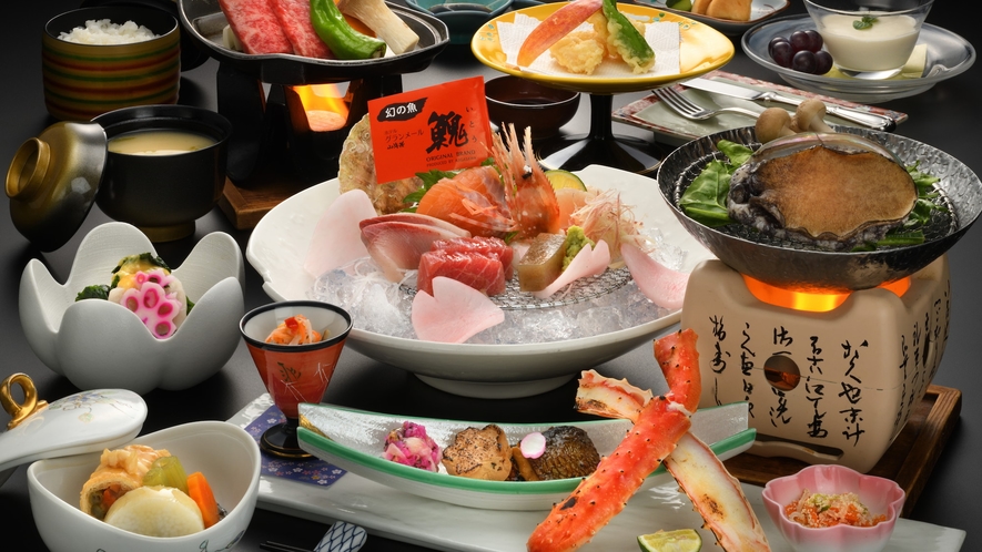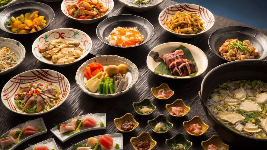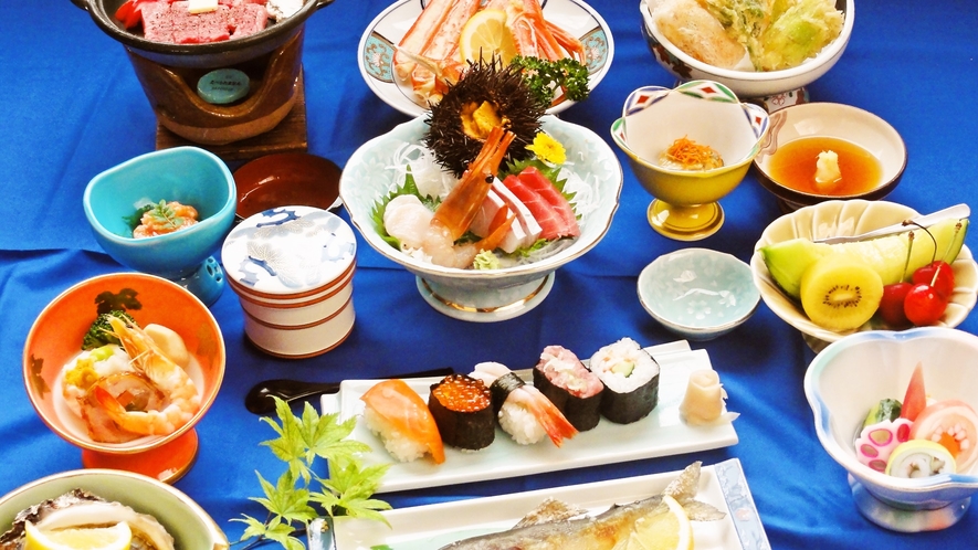 料理は、鯵ヶ沢エリアで 水揚げされる魚介を活かしたバイキングや会席料理を楽しめます。