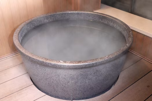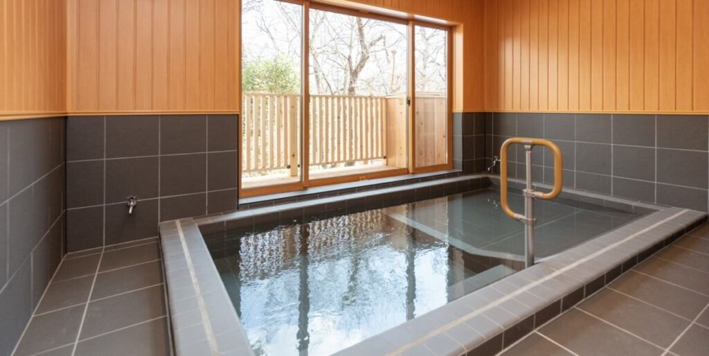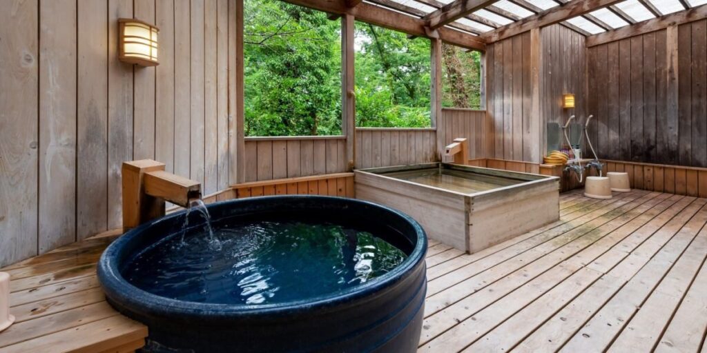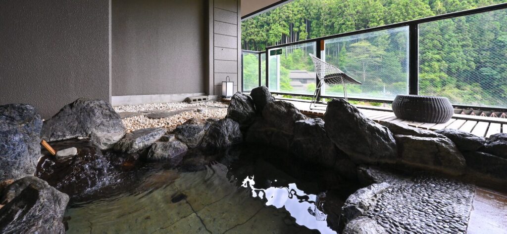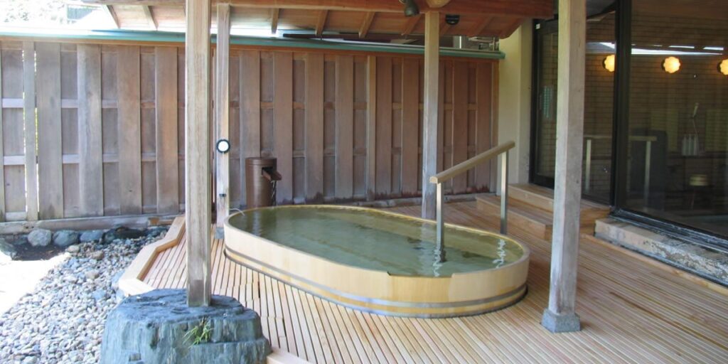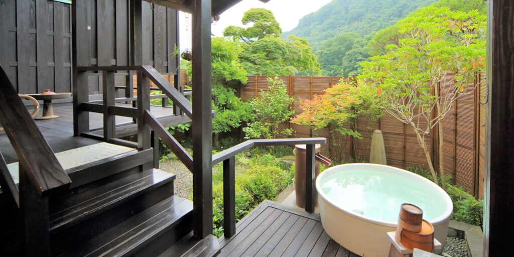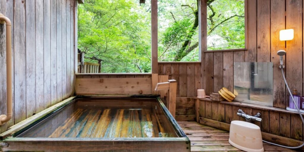 大人2名で入ってもゆったり入れる大きさの湯舟と、涼めるテラス付きです。