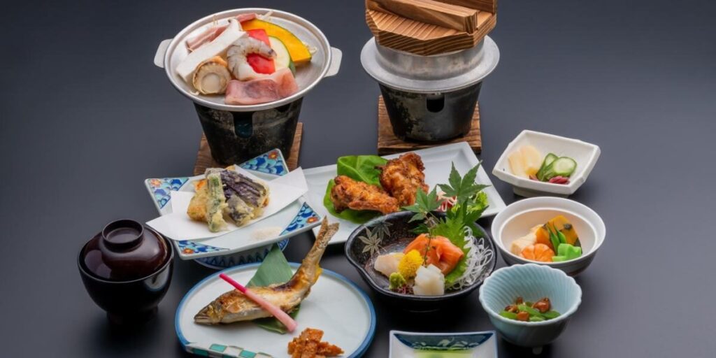 料理は、露天風呂付客室にお泊りの方と夕食グレードアッププランを申し込んだ方は、月ごとに献立を変えた懐石料理です。