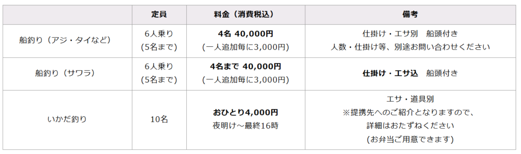 | 調理サービス | あり 内臓処理・氷詰代は無料 たくさん釣れて、夕食で提供するもの以外は、魚代かかります |