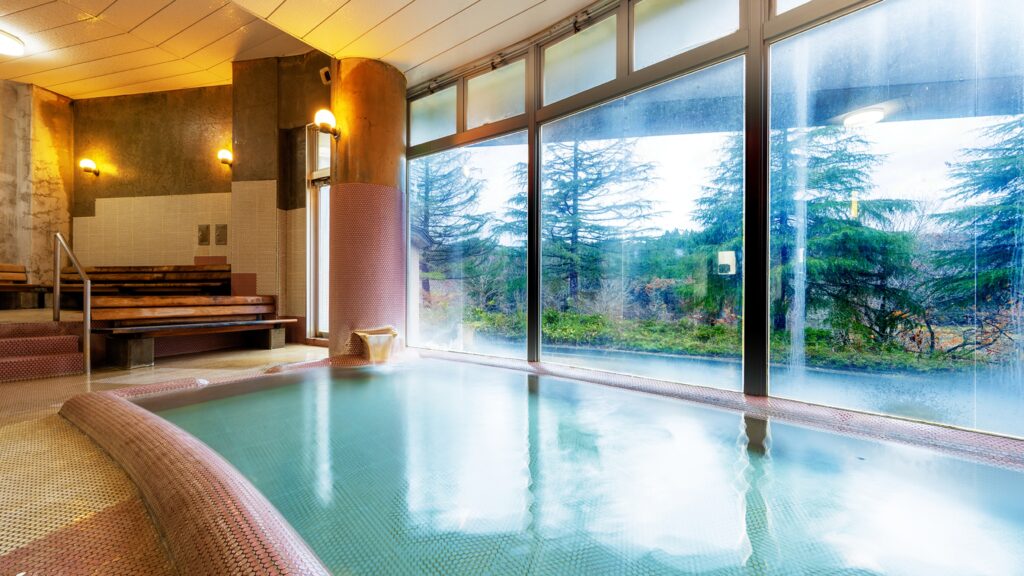 フォレストビューの温泉はまるで森林浴をしているかのような開放感があり、毎分720リットルの豊富な湯量が魅力。
