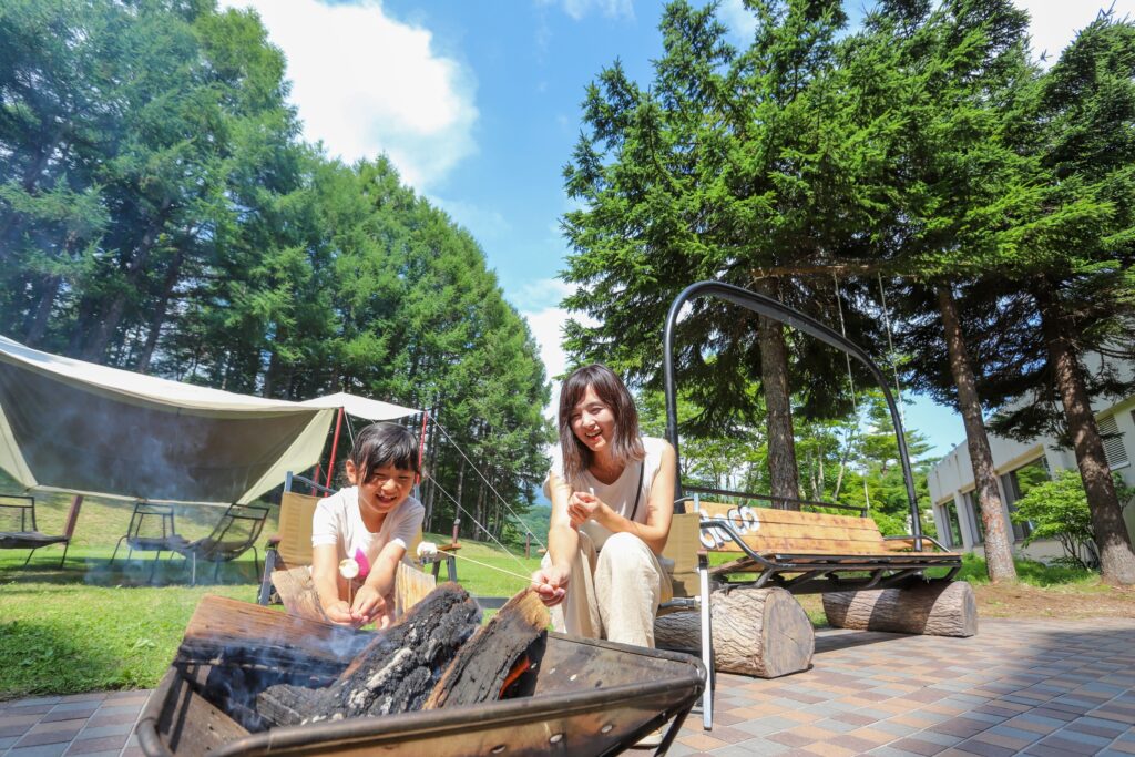 ウェルカムテラスでは焚き火&マシュマロ焼き体験ができ、テラス前の芝生で走り回ったりハンモックでくつろいだりと、自然の中でゆったり過ごせます。