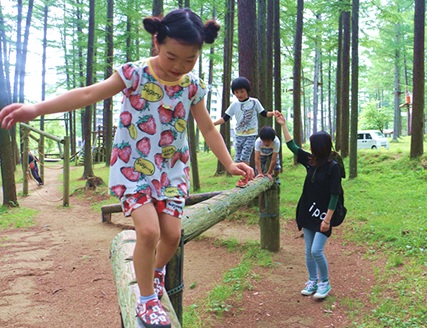 林の中にあるアスレチック遊具「森の遊び場」は、小さなお子さんでも安心して遊べる設計になっています。