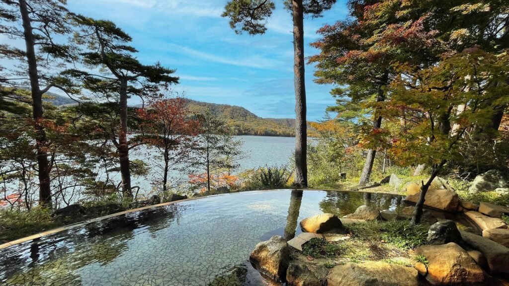 露天風呂からは桧原湖と磐梯山の絶景を楽しめ、大人のリフレッシュにも最適です。