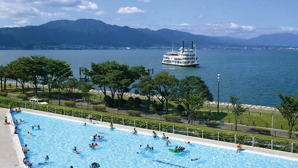 夏季には全長90m・琵琶湖の形を模した屋外プールがオープン。
