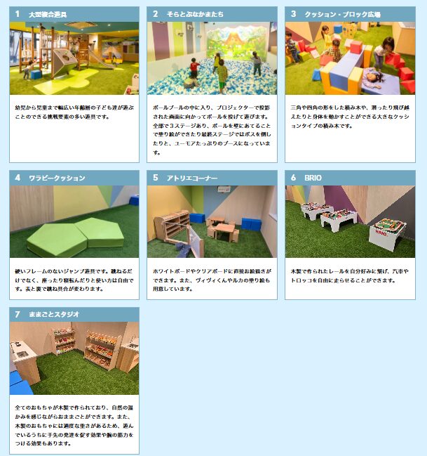 中でも、子連れファミリーの滞在時間が長くなりやすいのが、次の施設です。