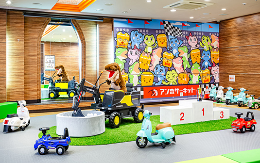 さまざまなのりものに乗って遊べるのりもの広場には、ぐるっと走れるサーキットを完備。