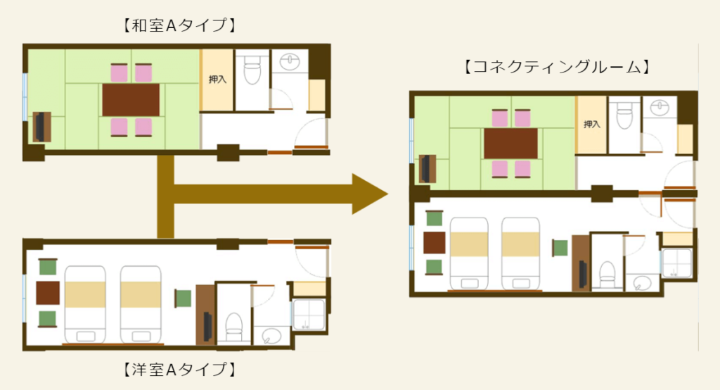 和室Aタイプと洋室Aタイプはコネクティングルームになっていて、内側のドアで行き来することができます。