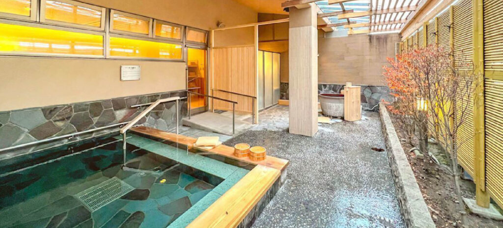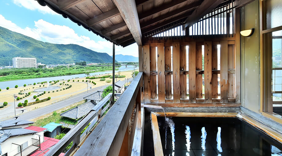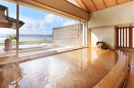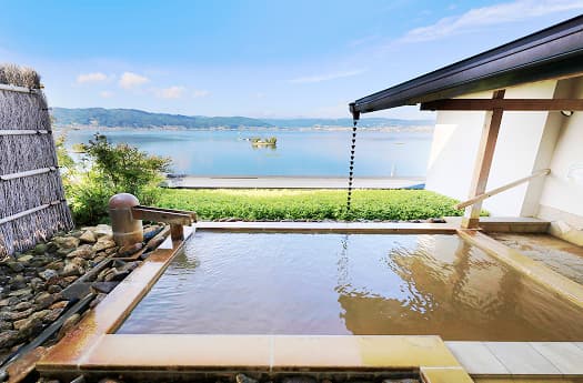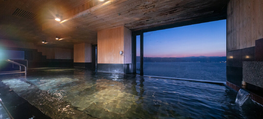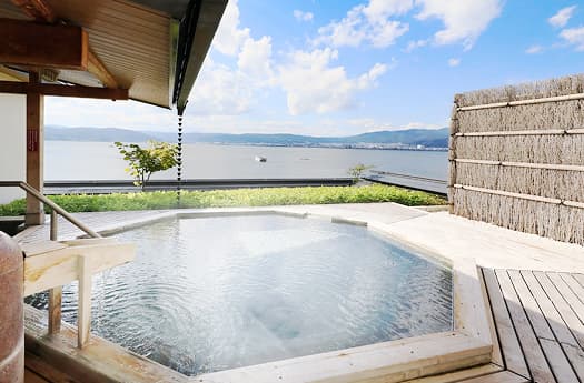 露天風呂は「朱の湯」で、目の前に諏訪湖が広がり、天気のいい日には星空を眺めながら入浴できますよ。