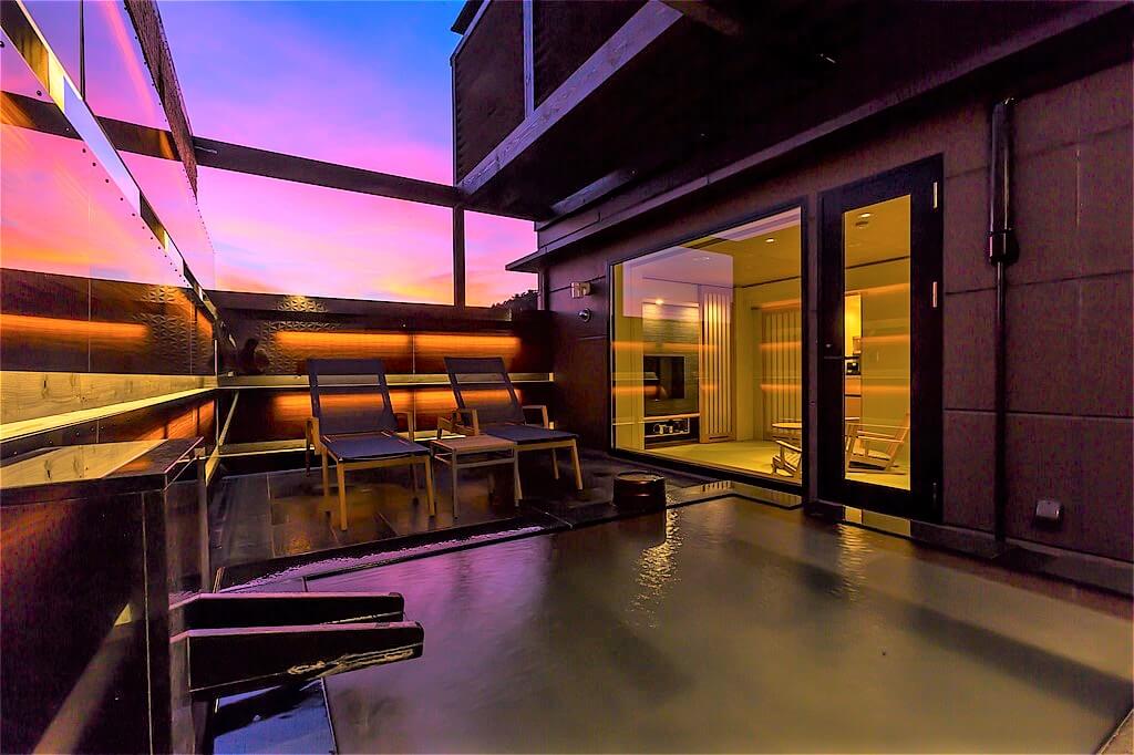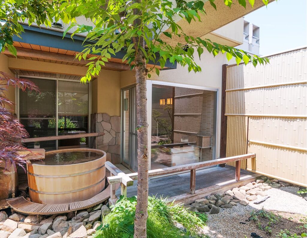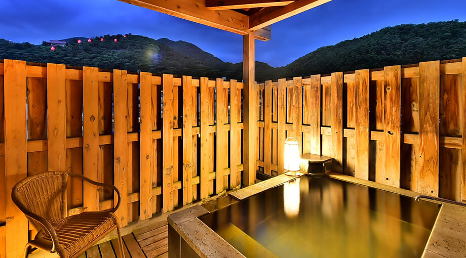 和洋室タイプの露天風呂付客室では、「白の湯」を好きな時間にのんびりと堪能できます。