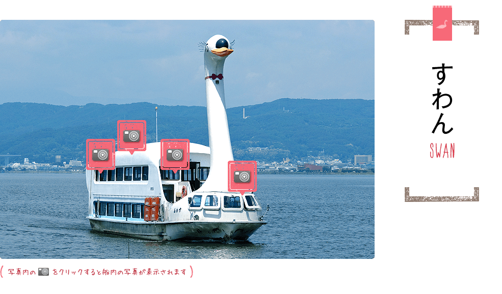 遊覧船は2つのタイプがあり、座席が多くゆったりと座れる「すわん」と、360度パノラマデッキの新型遊覧船「スワコスターマイン号」があります。